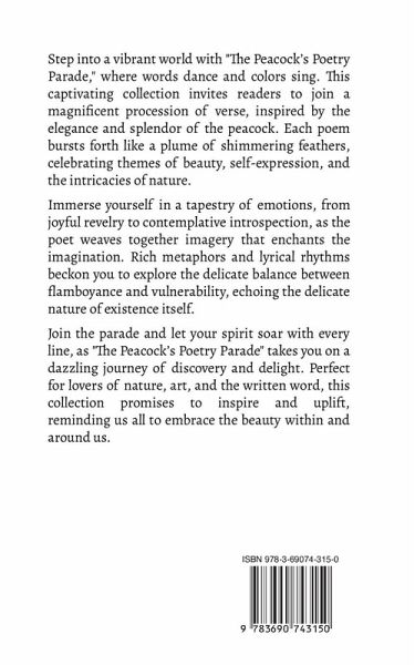 Step into a vibrant world with "The Peacock's Poetry Parade," where words dance and colors sing. This captivating collection invites readers to join a magnificent procession of verse, inspired by the elegance and splendor of the peacock. Each poem bursts forth like a plume of shimmering feathers, celebrating themes of beauty, self-expression, and the intricacies of nature. Immerse yourself in a tapestry of emotions, from joyful revelry to contemplative introspection, as the poet weaves together imagery that enchants the imagination. Rich metaphors and lyrical rhythms beckon you to explore the delicate balance between flamboyance and vulnerability, echoing the delicate nature of existence itself. Join the parade and let your spirit soar with every line, as "The Peacock's Poetry Parade" takes you on a dazzling journey of discovery and delight. Perfect for lovers of nature, art, and the written word, this collection promises to inspire and uplift, reminding us all to embrace the beauty within and around us.