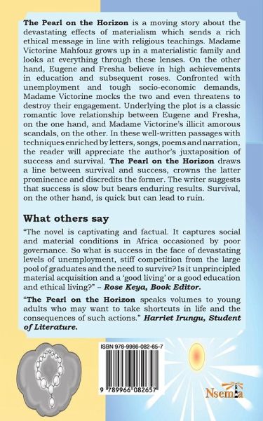 The Pearl on the Horizon is a moving story about the devastating effects of materialism which sends a rich ethical message in line with religious teachings. Madame Victorine Mahfouz grows up in a materialistic family and looks at everything through these lenses. On the other hand, Eugene and Fresha believe in high achievements in education and subsequent roses. Confronted with unemployment and tough socio-economic demands, Madame Victorine mocks the two and even threatens to destroy their engagement. Underlying the plot is a classic romantic love relationship between Eugene and Fresha, on the one hand, and Madame Victorine's illicit amorous scandals, on the other. In these well-written passages with techniques enriched by letters, songs, poems and narration, the reader will appreciate the author's juxtaposition of success and survival. The Pearl on the Horizon draws a line between survival and success, crowns the latter prominence and discredits the former. The writer suggests that success is slow but bears enduring results. Survival, on the other hand, is quick but can lead to ruin.
