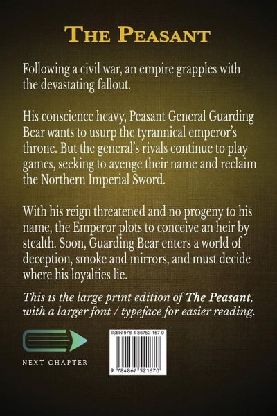 Following a civil war, an empire grapples with the devastating fallout. His conscience heavy, Peasant General Guarding Bear wants to usurp the tyrannical emperor's throne. But the general's rivals continue to play games, seeking to avenge their name and reclaim the Northern Imperial Sword. With his reign threatened and no progeny to his name, the Emperor plots to conceive an heir by stealth. Soon, Guarding Bear enters a world of deception, smoke and mirrors, and must decide where his loyalties lie. This is the large print edition of The Peasant, with a larger font / typeface for easier reading.