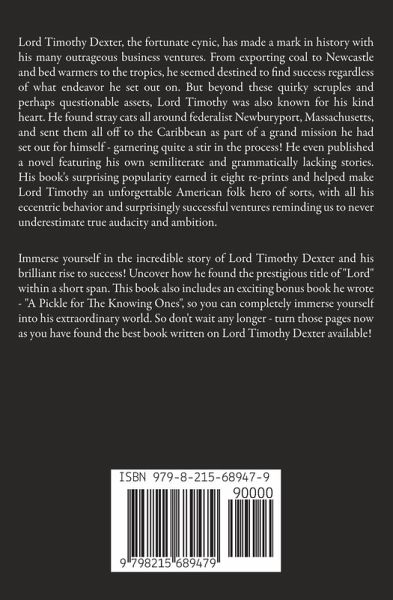 Lord Timothy Dexter, the fortunate cynic, has made a mark in history with his many outrageous business ventures. From exporting coal to Newcastle and bed warmers to the tropics, he seemed destined to find success regardless of what endeavor he set out on. But beyond these quirky scruples and perhaps questionable assets, Lord Timothy was also known for his kind heart. He found stray cats all around federalist Newburyport, Massachusetts, and sent them all off to the Caribbean as part of a grand mission he had set out for himself - garnering quite a stir in the process! He even published a novel featuring his own semiliterate and grammatically lacking stories. His book's surprising popularity earned it eight re-prints and helped make Lord Timothy an unforgettable American folk hero of sorts, with all his eccentric behavior and surprisingly successful ventures reminding us to never underestimate true audacity and ambition. Immerse yourself in the incredible story of Lord Timothy Dexter and his brilliant rise to success! Uncover how he found the prestigious title of "Lord" within a short span. This book also includes an exciting bonus book he wrote - "A Pickle for The Knowing Ones", so you can completely immerse yourself into his extraordinary world. So don't wait any longer - turn those pages now as you have found the best book written on Lord Timothy Dexter available!