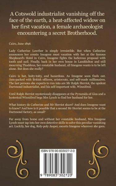 A Cotswold industrialist vanishing off the face of the earth, a heat-affected widow on her first vacation, a female archaeologist encountering a secret Brotherhood. Cairo, June 1896 Lady Catherine Lowther is simply irresistible. But when Catherine announces her cousin Imogene must vacation with her at the famous Shepheard's Hotel in Cairo, Imogene fights the ludicrous proposal with tooth and nail. Finally, back in her own house in Landdulton and still mourning Thaddeus, her constable husband, all Imogene wants is to be left alone. But does she really? Cairo is hot, hoity-toity, and hazardous. As Imogene soon finds out. Jam-packed with British officers, aristocrats, and self-made millionaires. The last persons she expects to run into are Mr Ralph Herriot, the opulent Dartmond industrialist, and his self-important wife, Winnifred. Until Ralph Herriot mysteriously disappears at the Pyramids of Giza and a hysterical Winnifred begs Mrs Lynch to find her husband for her. What history do Catherine and Mr Herriot share? And does Imogene want to know? And how is it possible that a second Mr Herriot seems to be at the Dartmond factory, as usual? Far away from home and without her constable husband to assist her, Mrs Imogene Lynch must tap into all her detective knowledge and skills to solve the peculiar vanishing act of Mr Ralph Herriot.