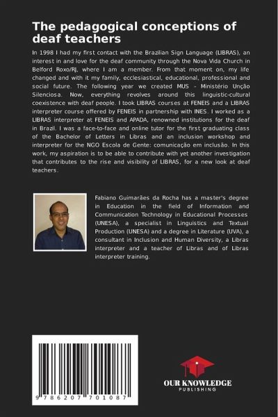 In 1998 I had my first contact with the Brazilian Sign Language (LIBRAS), an interest in and love for the deaf community through the Nova Vida Church in Belford Roxo/RJ, where I am a member. From that moment on, my life changed and with it my family, ecclesiastical, educational, professional and social future. The following year we created MUS - Ministério Unção Silenciosa. Now, everything revolves around this linguistic-cultural coexistence with deaf people. I took LIBRAS courses at FENEIS and a LIBRAS interpreter course offered by FENEIS in partnership with INES. I worked as a LIBRAS interpreter at FENEIS and APADA, renowned institutions for the deaf in Brazil. I was a face-to-face and online tutor for the first graduating class of the Bachelor of Letters in Libras and an inclusion workshop and interpreter for the NGO Escola de Gente: comunicação em inclusão. In this work, my aspiration is to be able to contribute with yet another investigation that contributes to the rise and visibility of LIBRAS, for a new look at deaf teachers.