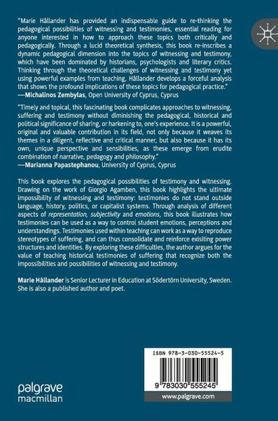 "Marie Hållander has provided an indispensable guide to re-thinking the pedagogical possibilities of witnessing and testimonies, essential reading for anyone interested in how to approach these topics both critically and pedagogically. Through a lucid theoretical synthesis, this book re-inscribes a dynamic pedagogical dimension into the topics of witnessing and testimony, which have been dominated by historians, psychologists and literary critics. Thinking through the theoretical challenges of witnessing and testimony yet using powerful examples from teaching, Hållander develops a forceful analysis that shows the profound implications of these topics for pedagogical practice."