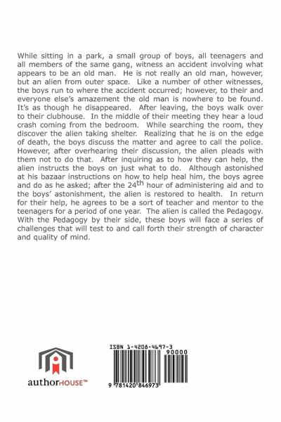 While sitting in a park, a small group of boys, all teenagers and all members of the same gang, witness an accident involving what appears to be an old man. He is not really an old man, however, but an alien from outer space. Like a number of other witnesses, the boys run to where the accident occurred; however, to their and everyone else's amazement the old man is nowhere to be found. It's as though he disappeared. After leaving, the boys walk over to their clubhouse. In the middle of their meeting they hear a loud crash coming from the bedroom. While searching the room, they discover the alien taking shelter. Realizing that he is on the edge of death, the boys discuss the matter and agree not to call the police. However, after overhearing their discussion, the alien pleads with them not to do that. After inquiring as to how they can help, the alien instructs the boys on just what to do. Although astonished at his bazaar instructions on how to help heal him, the boys agree and do as he asked; after the 24th hour of administering aid and to the boys' astonishment, the alien is restored to health. In return for their help, he agrees to be a sort of teacher and mentor to the teenagers for a period of one year. The alien is called the Pedagogy. With the Pedagogy by their side, these boys will face a series of challenges that will test to and call forth their strength of character and quality of mind.