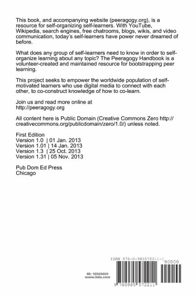 This book, and accompanying website, is a resource for self-organizing self-learners. With YouTube, Wikipedia, search engines, free chatrooms, blogs, wikis, and video communication, today's self-learners have power never dreamed-of before. What does any group of self-learners need to know in order to self-organize learning about any topic? This project seeks to empower the worldwide population of self-motivated learners who use digital media to connect with each other, to co-construct knowledge of how to co-learn. Read the HTML e-book and get involved with us! http://peeragogy.org Download the PDF e-book for free! http://peeragogy.net/peeragogy-1.3.1-print.pdf