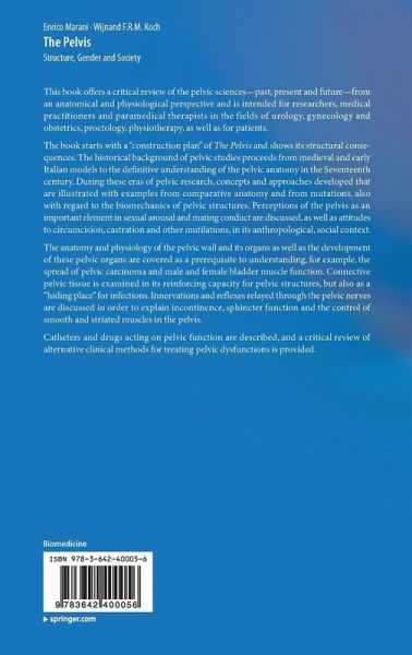 The book starts with a "construction plan" of the pelvis and shows its structural consequences. The historical background of pelvic studies proceeds from medieval and early Italian models to the definitive understanding of the pelvic anatomy in the Seventeenth century. During these eras of pelvic research, concepts and approaches developed that are illustrated with examples from comparative anatomy and from mutations, also with regard to the biomechanics of pelvic structures. Perceptions of the pelvis as an important element in sexual arousal and mating conduct are discussed, as well as attitudes to circumcision, castration and other mutilations, in its anthropological, social context.