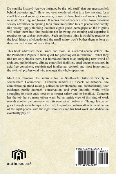 When Charles Stratham, a retired pharmaceutical chemist, decided to delve into genealogy to fill his free time, he and his wife discover their ancestors had more to do with each other than they ever imagined. This story is not only about life in a small town in southeastern Connecticut. It also provides real insights into the operations of a small historical society. New England is dotted with lots of historical sites, museums, and historical societies. Have you ever wondered what it's like working in a place like that? Read the Pemberton Papers and gain an insider's view of public history. Based on a combination of factual and fictitious events in southeastern Connecticut between 2002 and 2004, archivist Jim Cameron leads the Strathams through the maze of historical documents that reveal a scandalous episode in their genealogies. In addition, the sequence of events illustrates how historical societies fit in their communities-some of which are fun and quaint, while others involve important legal, ethical and business issues. The Pemberton Papers is a novella with an appendix (the collection guide to the Pemberton Papers) which was deposited in the Southwick Historical Society in 1996. Katherine Ann Tennant Pemberton was a social activist/suffragette/prohibitionist in the early twentieth century, whose modus operandi for achieving her objectives was more radical than those of her peers. Then, in 1996 one of Katherine's great-grand-daughters found her papers in a steamer trunk in the attic of the family home and donated the collection to the local historical society (with no restrictions on access). As fate would have it, another great-grand-daughter and her husband later decided they wanted to pursue genealogy as a hobby. You'll never guess what they found.