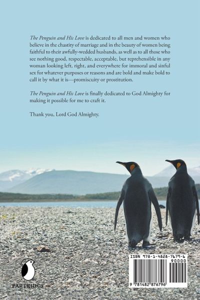 The Penguin and His Love is dedicated to all men and women who believe in the chastity of marriage and in the beauty of women being faithful to their awfully-wedded husbands, as well as to all those who see nothing good, respectable, acceptable, but reprehensible in any woman looking left, right, and everywhere for immoral and sinful sex for whatever purposes or reasons and are bold and make bold to call it by what it is—promiscuity or prostitution. The Penguin and His Love is finally dedicated to God Almighty for making it possible for me to craft it. Thank you, Lord God Almighty.