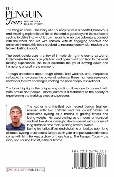 The Penguin Tours - The Diary of a Touring Cyclist is a heartfelt, humorous, and inspiring exploration of life on the road. It goes beyond the surface of cycling to delve into what it truly means to embrace adventure, connect with the world, and live with passion. With its engaging narrative and universal themes, this book is poised to resonate deeply with readers and leave a lasting impact. The book celebrates the Joy of Simple Living in a complex world. It demonstrates how a bicycle tour, and open mind can lead to the most fulfilling experiences. The tours celebrate the joy of slowing down and immersing oneself in the moment. Through anecdotes about tough climbs, bad weather, and unexpected setbacks, it showcases the power of resilience. These moments serve as a metaphor for life's challenges, making the book deeply inspirational. The book highlights the unique way cycling allows one to connect with both nature and people. Bland's journey is a testament to the beauty of experiencing the world up close and personal.