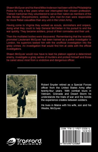 Shawn McGyver and his friend Mike Anderson had been with the Philadelphia Police for only a few years when war interrupted their chosen profession. Trained marksman they volunteered to serve their nation as members of the elite Berdan Sharpshooters; soldiers, who man-for-man were responsible for more Rebel casualties than any unit in the Union Army. Having come to Virginia they worked as scout, skirmisher and sniper, doing what they could to help General McClellan in his pursuit to end the war quickly. They became soldiers, proud of their comrades and their unit. Then the mutilated bodies were discovered. Remembering that the recently promoted Lieutenant McGyver had been trained as a police investigator in London, his superiors tasked him with the unofficial investigation into the grisly crimes. An investigation that would find him at odds with the official investigators. Shawn McGyver would now have to lead his platoon against a determined enemy, investigate a grisly series of murders and protect himself and those he cared about most from a vindictive and dangerous officer.