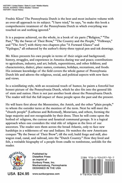Fredric Klees' The Pennsylvania Dutch is the best and most inclusive volume with an over-all approach to its subject. "I have tried," he says, "to make this book a comprehensive treatment of the Pennsylvania Dutch in which everything was touched on and nothing ignored." It is a purpose achieved, on the whole, in a book of six parts ("Religion," "The Past," "By the Sweat of Their Brow," "The Country and the People," "Folkways," and "The Arts") with thirty-two chapters plus "A Forward Glance" and "Epilogue," all enhanced by the author's thirty-three typical pen-and-ink drawings. Mr. Klees presents his own people in terms of their origin and background; history, struggles, and experience in America during war and peace; contributions to agriculture, industry, and art; beliefs, superstitions, and other folklore; and characteristics, dialect, place names, costumes, holidays, recreations, and foods. His intimate knowledge of the field covers the whole gamut of Pennsylvania Dutch life and adorns the religious, social, and political aspects with new facts and views. In a scintillating style, with an occasional touch of humor, he paints a forceful but honest picture of the Pennsylvania Dutch, which he also fits into the general life of state and nation. Here is not just another book about the Pennsylvania Dutch. The reader will feel the full impact of these people upon the past and the present. He will learn first about the Mennonites, the Amish, and the other "plain people," to whom the outsider turns at the mention of the term. Next he will meet the "church people" (Lutheran and Reformed), Moravians, and others, forming the large majority and not recognizable by their dress. Then he will come upon the hotbed of religions, the curious and fanatical communal groups. It is a logical approach when one considers the vital r6le of religion in the lives of our ancestors. The reader sees them across the broad Atlantic, only to face new hardships in a wilderness of war and Indians. He watches the new Americans conquer "By the Sweat of Their Brow"; till the soil; build forge and mill, also wagon road, canal, and railroad, into the "Dutch Country." How they lived and felt, a veritable biography of a people from cradle to tombstone, unfolds for the reader.