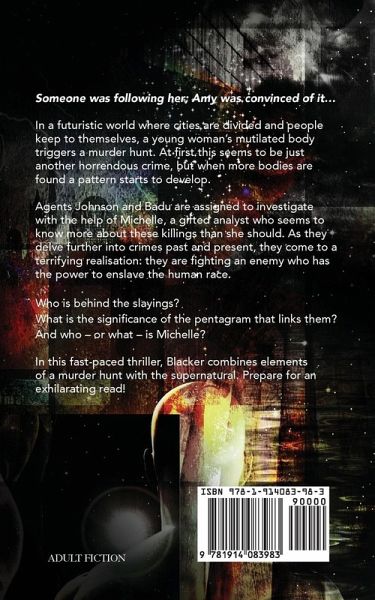 In a futuristic world where cities are divided and people keep to themselves, a young woman's mutilated body triggers a murder hunt. At first this seems to be just another horrendous crime, but when more bodies are found a pattern starts to develop. Agents Johnson and Badu are assigned to investigate with the help of Michelle, a gifted analyst who seems to know more about these killings than she should. As they delve further into crimes past and present, they come to a terrifying realisation: they are fighting an enemy who has the power to enslave the human race. Who is behind these slaying? What is the significance of the pentagram that links them? And who - or what - is Michelle? In this fast-paced thriller, Blacker combines elements of a murder hunt with the supernatural. Prepare for an exhilarating read!