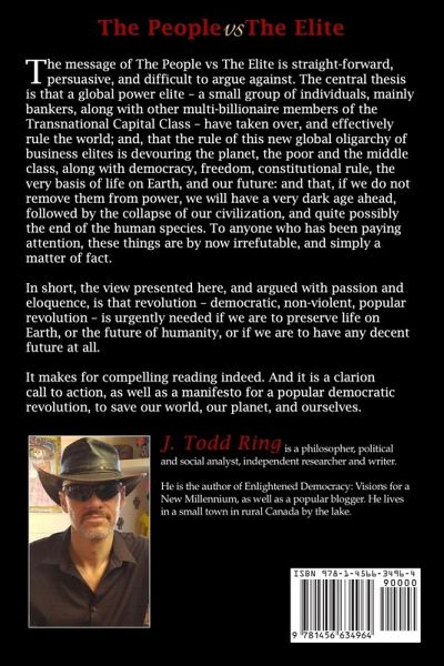 The message of The People vs The Elite is straight-forward, persuasive, and difficult to argue against. The central thesis is that a global power elite – a small group of individuals, mainly bankers, along with other multi-billionaire members of the Transnational Capital Class – have taken over, and effectively rule the world; and, that the rule of this new global oligarchy of business elites is devouring the planet, the poor and the middle class, along with democracy, freedom, constitutional rule, the very basis of life on Earth, and our future: and that, if we do not remove them from power, we will have a very dark age ahead, followed by the collapse of our civilization, and quite possibly the end of the human species. To anyone who has been paying attention, these things are by now irrefutable, and simply a matter of fact. In short, the view presented here, and argued with passion and eloquence, is that revolution – democratic, non-violent, popular revolution – is urgently needed if we are to preserve life on Earth, or the future of humanity, or if we are to have any decent future at all. It makes for compelling reading indeed. And it is a clarion call to action, as well as a manifesto for a popular democratic revolution, to save our world, our planet, and ourselves.