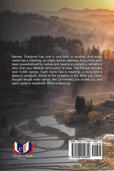 Names. Everyone has one in one form or another. And every name has a meaning, an origin, and an address. If you have ever been overwhelmed by names and need a scorecard to tell who is who, then your Biblical "who's who" is here. The People includes over 3,400 names. Each name has a meaning, a story and a place in scripture. Some of the chapters in the Bible you never thought would make sense, like Chronicles, are sorted out, and each name is explained. What a blessing!