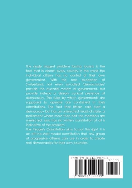 The single biggest problem facing society is the fact that in almost every country in the world the individual citizen has no control of their own government. With the rare exception of Switzerland, not even so-called "democracies" provide this essential system of government, but provide instead a deeply cynical pretence of democracy. The rules by which governments are supposed to operate are contained in their constitutions. The fact that Britain calls itself a democracy but has an unelected head of state, a parliament where more than half the members are unelected, and has no written constitution at all is indicative of the problem. The People's Constitution aims to put this right. It is an off-the-shelf model constitution that any group of progressive citizens can use in order to create real democracies for their own countries.