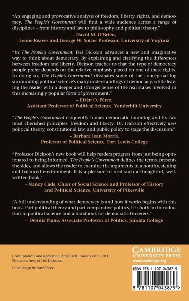 The People's Government is premised on the idea that democracy is based on two fundamental rights: freedom and liberty. Liberty is the right to be left alone, while freedom is the right to participate in a political community. How people view democracy depends on which of these two rights they think is more important. Liberal democrats place a higher value on liberty, while free democrats see freedom as the primary right. From this starting point, the author adds five dimensions to define and distinguish democratic societies: rights, participation and representation, inclusion, equality, and power. Liberal democracies emphasize individualism, negative rights, representative government, inclusive citizenship, equal opportunity, and limited government. Free democracies stress community, positive rights, direct participation, exclusive citizenship, equal outcomes, and robust government. The book examines the most important arguments for and against democracy, and explores the life cycle of democracies - how countries democratize, mature, and fail. Finally, the author uses the five dimensions established earlier to evaluate and grade American democracy.