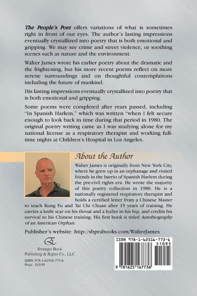 The People's Poet offers variations of what is sometimes right in front of our eyes. The author's lasting impressions eventually crystallized into poetry that is both emotional and gripping. We may see crime and street violence, or soothing scenes such as nature and the environment. Walter James wrote his earlier poetry about the dramatic and the frightening, but his more recent poems reflect on more serene surroundings and on thoughtful contemplations including the future of mankind. His lasting impressions eventually crystallized into poetry that is both emotional and gripping. Some poems were completed after years passed, including "In Spanish Harlem," which was written "when I felt secure enough to look back in time during that period in 1980. The original poetry writing came as I was studying alone for my national license as a respiratory therapist and working full-time nights at Children's Hospital in Los Angeles. About the Author Walter James is originally from New York City, where he grew up in an orphanage and visited friends in the barrio of Spanish Harlem during the pre-civil rights era. He wrote the majority of this poetry collection in 1980. He is a nationally registered respiratory therapist and holds a certified letter from a Chinese Master to teach Kung Fu and Tai Chi Chuan after 15 years of training. He carries a knife scar on his throat and a bullet in his hip, and credits his survival to his Chinese training. His first book is titled Autobiography of an American Orphan.
