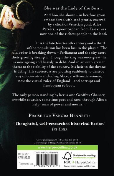Set in late fourteenth century England, Vanora Bennett's rich, dramatic new novel presents an England uncannily like our own. The country is in turmoil, The King is in debt to the City, and the old order had broken down - a time of opportunity indeed, for those who can seize the moment. The king's mistress, Alice Perrers, becomes the virtual ruler of the country from his sickbed. Disliked and despised by the Black Prince and his cronies, her strong connections to the merchants make her a natural ally for the king's ambitious second son, John of Gaunt.Together they create a powerful position in the city for one of his henchmen, Geoffrey Chaucer. In this moment of opportunity, Alice throws herself into her new role and the riches that lay before her, but Chaucer, even though her lover and friend, is uneasy over what he can foresee of the conspiracies around them. At the centre of these troubled times and political unrest stands the remarkable figure of a woman who, having escaped the plague which killed her whole family, is certain she is untouchable, and a man who learns that cleverness and ambition may for him sit too uneasily with decency and honesty.