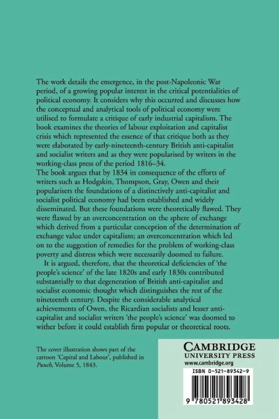 The work details the emergence, in the post-Napoleonic War period, of a growing popular interest in the critical potentialities of political economy. It considers why this occurred and discusses how the conceptual and analytical tools of political economy were utilised to formulate a critique of early industrial capitalism. The book examines the theories of labour exploitation and capitalist crisis which represented the essence of that critique both as they were elaborated by early-nineteenth-century British anti-capitalist and socialist writers and as they were popularised by writers in the working-class press of the period 1816-34. The book argues that by 1834 in consequence of the efforts of writers such as Hodgskin, Thompson, Gray, Owen and their popularisers the foundations of a distinctively anti-capitalist and socialist political economy had been established and widely disseminated. But these foundations were theoretically flawed. They were flawed by an overconcentration on the sphere of exchange which derived from a particular conception of the determination of exchange value under capitalism; an overconcentration which led on to the suggestion of remedies for the problem of working-class poverty and distress which were necessarily doomed to failure.