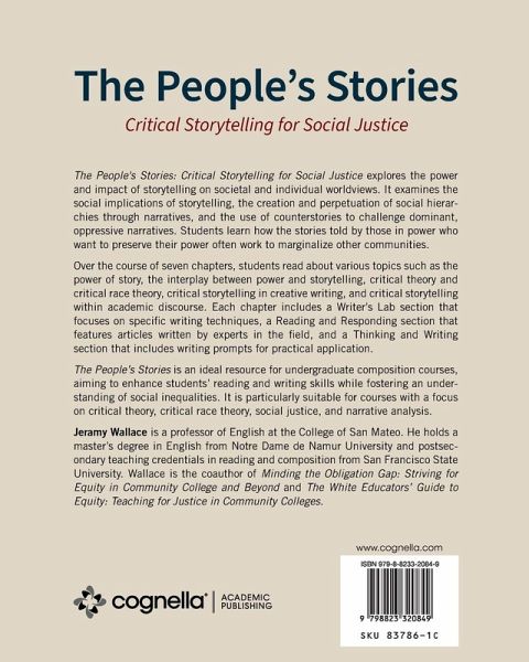 The People's Stories: Critical Storytelling for Social Justice explores the power and impact of storytelling on societal and individual worldviews. It examines the social implications of storytelling, the creation and perpetuation of social hierarchies through narratives, and the use of counterstories to challenge dominant, oppressive narratives. Students learn how the stories told by those in power who want to preserve their power often work to marginalize other communities. Over the course of seven chapters, students read about various topics such as the power of story, the interplay between power and storytelling, critical theory and critical race theory, critical storytelling in creative writing, and critical storytelling within academic discourse. Each chapter includes a Writer's Lab section that focuses on specific writing techniques, a Reading and Responding section that features articles written by experts in the field, and a Thinking and Writing section that includes writing prompts for practical application. The People's Stories is an ideal resource for undergraduate composition courses, aiming to enhance students' reading and writing skills while fostering an understanding of social inequalities. It is particularly suitable for courses with a focus on critical theory, critical race theory, social justice, and narrative analysis.