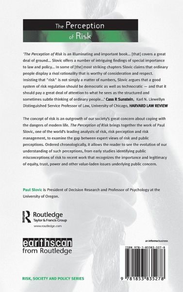 The concept of risk is an outgrowth of our society's great concern about coping with the dangers of modern life. The Perception of Risk brings together the work of Paul Slovic, one of the world's leading analysts of risk, risk perception and risk management, to examine the gap between expert views of risk and public perceptions. Ordered chronologically, it allows the reader to see the evolution of our understanding of such perceptions, from early studies identifying public misconceptions of risk to recent work that recognizes the importance and legitimacy of equity, trust, power and other value-laden issues underlying public concern.