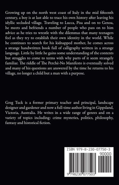 Growing up on the north west coast of Italy in the mid fifteenth century, a boy is at last able to trace his own history after leaving his idyllic secluded village. Traveling to Lucca, Pisa and on to Genoa, he meets and befriends a number of people who pass on to him advice as he tries to wrestle with the dilemmas that many teenagers feel as they try to establish their own identity in the world. While he continues to search for his kidnapped mother, he comes across a strange handwritten book full of calligraphy written in a strange language. Little by little he gains some understanding of the contents but struggles to come to terms with why parts of it seem strangely familiar. The riddle of The Perchè-No Manifesto is eventually solved and many of his questions are answered by the time he returns to his village, no longer a child but a man with a purpose.