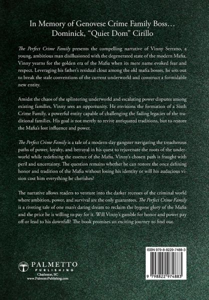Meet Vinny Serrano: Young Visionary Aiming to Resurrect Mafia Glory through a Bold New Syndicate. Navigating Power, Loyalty, Betrayal, Can He Succeed Without Losing Himself? In The Perfect Crime Family, we delve into the life of Vinny Serrano, a young man disillusioned by the current state of the Mafia. Recognizing the dwindling influence and disunity of the modern syndicates, Vinny is driven by a relentless ambition to restore the power and prestige of the crime world. He yearns for the glory days of the old Mafia, a time when their name alone commanded respect and fear. Using his father's lingering reputation among the old guard, Vinny is determined to shatter the tired norms of the present-day underworld and build something entirely new and formidable. As the underworld shifts and splinters, power struggles escalate among the existing families. Vinny, however, sees this chaos as an opportunity. His daring vision is the creation of a Sixth Crime Family, a force potent enough to challenge the waning legacies of the traditional families. His aim is not just to revive old traditions but to resurrect the Mafia's former power and influence. The Perfect Crime Family is a story of a modern-day gangster trying to navigate the treacherous waters of power, loyalty, and betrayal. It's about Vinny's journey to bring the underworld back to its roots while also attempting to redefine what it means to be a Mafia in the present day. The path he has chosen is laden with danger and uncertainty. Can Vinny restore the honor and tradition that once defined the Mafia without losing himself in the process? Or will his vision cost him everything he holds dear? In this thrilling narrative, readers will explore the darker corners of the criminal world, where ambition, power, and survival are the only constants. The Perfect Crime Family is a gripping tale of one man's audacious dream to reclaim the Mafia's past glory and the price he's willing to pay for it. Is Vinny ready to gamble everything for honor and power, or will his vision lead to his downfall? Dive in to find out.