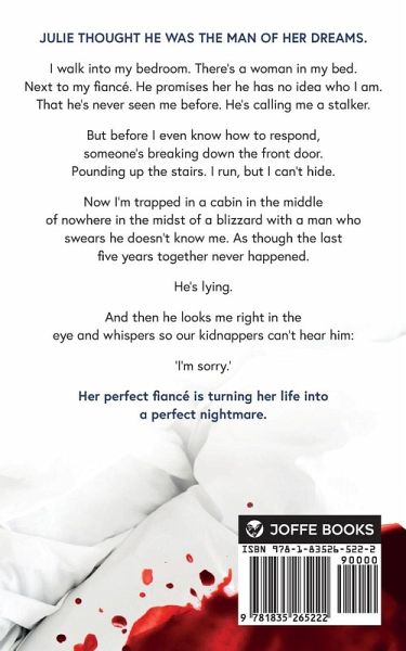 JUDY THOUGHT HE WAS THE MAN OF HER DREAMS. I walk into my bedroom. There's a woman in my bed. Next to my fiancé. He promises her he has no idea who I am. That he's never seen me before. He's calling me a stalker. But before I even know how to respond, someone's breaking down the front door. Pounding up the stairs. I run, but I can't hide. Now I'm trapped in a cabin in the middle of nowhere in the midst of a blizzard with a man who swears he doesn't know me. As though the last five years together never happened. He's lying. And then he looks me right in the eye and whispers so our kidnappers can't hear him: 'I'm sorry.' Her perfect fiancé is turning her life into a perfect nightmare.