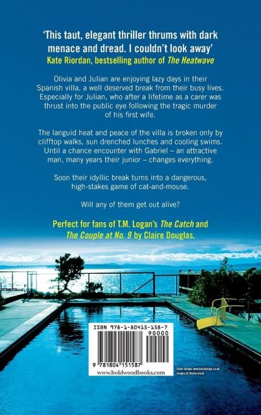 Perfect for fans of T.M. Logan's The Catch and The Couple at No. 9 by Claire Douglas. 'This taut, elegant thriller thrums with dark menace and dread. I couldn't look away' Kate Riordan, bestselling author of The Heatwave Olivia and Julian are enjoying lazy days in their Spanish villa, a well deserved break from their busy lives. Especially for Julian, who after a lifetime as a carer was thrust into the public eye following the tragic murder of his first wife. The languid heat and peace of the villa is broken only by clifftop walks, sun drenched lunches and cooling swims. Until a chance encounter with Gabriel - an attractive man, many years their junior - changes everything. Soon their idyllic break turns into a dangerous, high-stakes game of cat-and-mouse. Will any of them get out alive? ________ 'Wow! Beautifully written with a great sense of place that contrasts so well with what is going on behind doors' Valerie Keogh 'Tense, daring and totally addictive' Emma Christie 'An immersive, multi-layered story that provokes and excites' T.L. Huchu 'An unputdownable journey into the human condition asking the reader at every turn - how good are we really? How good are you?' Louise Dean 'The last time I had this sort of reaction to a character was when I read The Talented Mr Ripley' Mark Wightman 'A gripping, atmospheric and addictive read' Lesley Glaister 'Original, surprising and absolutely brimming with menace' Amanda Block.