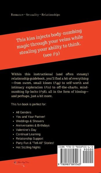 "This kiss injects body-numbing magic through your veins while stealing your ability to think (see #9)." Within this fun, instructional (and often steamy) relationship and how-to-be-a-good-kisser guidebook, you'll find romantic ideas and a bit of everything else, from sweet, small kisses (see #44) to self-worth and intimacy exploration (see #21) to off-the-charts, mind-numbing lip-locks (#38), all in the form of kissing and perhaps, just a bit more. This fun book is perfect for: All Genders You and Your Partner! Weddings and Showers Anniversaries & Birthdays Valentine's Day Relationship Support Continual Learning Party fun & "Tell-All" Stories! Hot Sizzling Nights Includes consent and safety information, as well as suggestions for using this guidebook and a checklist for trying out and rating the kisses inside. Read the kisses aloud with your partner, trying one kiss a day for ten days (or fifty!) If you don't have a partner right now, prepare for one. Something magical may happen...