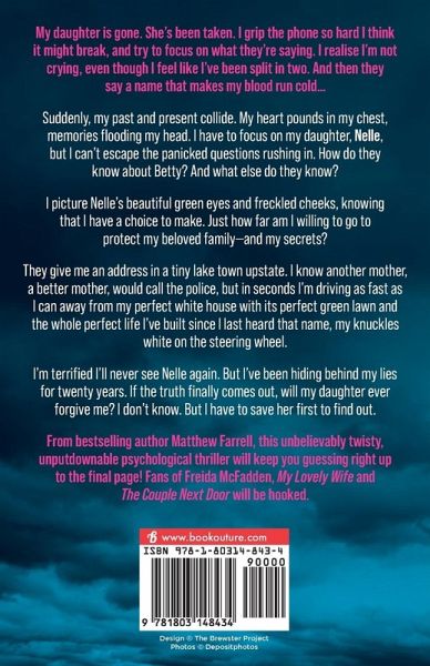 My daughter is gone. She's been taken. I grip the phone so hard I think it might break, and try to focus on what they're saying. I realise I'm not crying, even though I feel like I've been split in two. And then they say a name that makes my blood run cold... Suddenly, my past and present collide. My heart pounds in my chest, memories flooding my head. I have to focus on my daughter, Nelle, but I can't escape the panicked questions rushing in. How do they know about Betty? And what else do they know? I picture Nelle's beautiful green eyes and freckled cheeks, knowing that I have a choice to make. Just how far am I willing to go to protect my beloved family-and my secrets? They give me an address in a tiny lake town upstate. I know another mother, a better mother, would call the police, but in seconds I'm driving as fast as I can away from my perfect white house with its perfect green lawn and the whole perfect life I've built since I last heard that name, my knuckles white on the steering wheel. I'm terrified I'll never see Nelle again. But I've been hiding behind my lies for twenty years. If the truth finally comes out, will my daughter ever forgive me? I don't know. But I have to save her first to find out. From bestselling author Matthew Farrell, this unbelievably twisty, unputdownable psychological thriller will keep you guessing right up to the final page! Fans of Freida McFadden, My Lovely Wife and The Couple Next Door will be hooked. What readers are saying about We Have Your Daughter: "OMG!! I did not want to put this book down. This book is amaze! Talk about being thrown in from the get-go! I couldn't flip the pages fast enough... Had me reading well into the night! Make sure you are prepared for this, as once you start you won't be able to stop reading! An addictive, nail-biting read." NetGalley reviewer, ¿¿¿¿¿ "Geez! What the heck did I just read?!... Crazy twists and turns! Some really crazy twists!!... Had me glued to my Kindle!" NetGalley reviewer "Put everything else on hold, this book will grab you by the throat from the first to the last page. A tour de force of a crime thriller... Brilliant, original... I devoured it in one sitting... Shocking and full of surprises... a MUST READ!!!!" Goodreads reviewer, ¿¿¿¿¿ "Wow, what a read!! From the first page, I was hooked. I didn't want to put this down." @phoebeisreading_, ¿¿¿¿¿ "A one-sit read. The kind of twisty, jet-fuelled thriller that explodes on page one and has you happily abandoning work, sleep, and life as you race to the stunning end." NetGalley reviewer "The best book I've read this year... by a mile!!... Omg!... So many twists and turns that you absolutely do not see coming. My jaw was on the floor more than once! Original, shocking, fast-paced, suspenseful, tension-filled, jaw dropping... An amazing read that you won't be able to put it down." Goodreads reviewer, ¿¿¿¿¿ Readers love Matthew Farrell! "Mind blowing! A must read!!!!!" Goodreads reviewer, ¿¿¿¿¿
