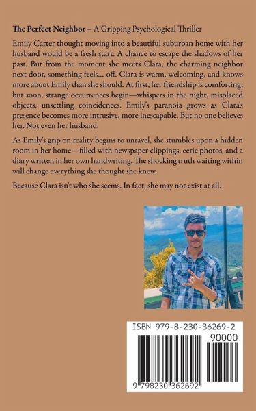 The Perfect Neighbor - A Gripping Psychological Thriller Emily Carter thought moving into a beautiful suburban home with her husband would be a fresh start. A chance to escape the shadows of her past. But from the moment she meets Clara, the charming neighbor next door, something feels... off. Clara is warm, welcoming, and knows more about Emily than she should. At first, her friendship is comforting, but soon, strange occurrences begin-whispers in the night, misplaced objects, unsettling coincidences. Emily's paranoia grows as Clara's presence becomes more intrusive, more inescapable. But no one believes her. Not even her husband. As Emily's grip on reality begins to unravel, she stumbles upon a hidden room in her home-filled with newspaper clippings, eerie photos, and a diary written in her own handwriting. The shocking truth waiting within will change everything she thought she knew. Because Clara isn't who she seems. In fact, she may not exist at all. Dark, haunting, and utterly unpredictable, The Perfect Neighbor will keep you on the edge of your seat until the very last page. Perfect for fans of Riley Sager, Gillian Flynn, and Alex Michaelides.
