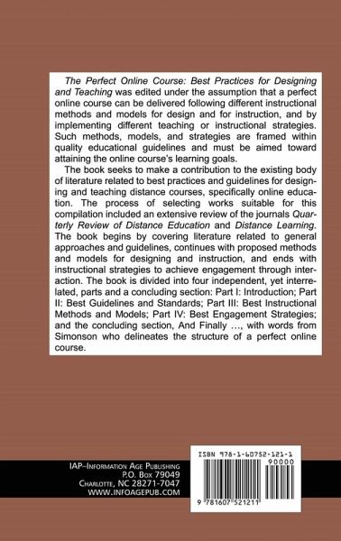 A volume in Perspectives in Instructional Technology and Distance Education Series Editors: Charles Schlosser and Michael Simonson Nova Southeastern University The Perfect Online Course: Best Practices for Designing and Teaching was edited under the assumption that a perfect online course can be delivered following different instructional methods and models for design and for instruction, and by implementing different teaching or instructional strategies. Such methods, models, and strategies are framed within quality educational guidelines and must be aimed towards attaining the online course's learning goals. The book seeks to make a contribution to the existing body of literature related to best practices and guidelines for designing and teaching distance courses, specifically online education. The process of selecting works suitable for this compilation included an extensive review of the journals Quarterly Review of Distance Education and Distance Learning. The book begins by covering literature related to general approaches and guidelines, continues with proposed methods and models for designing and instruction, and ends with instructional strategies to achieve engagement through interaction. The book is divided into four independent, yet interrelated, parts and a concluding section: Part I: Introduction; Part II: Best Guidelines and Standards; Part III: Best Instructional Methods and Models; Part IV: Best Engagement Strategies; and the concluding section, And Finally..., with words from Simonson who delineates the structure of a perfect online course.