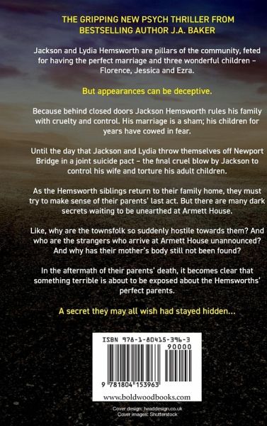 The gripping new psych thriller from bestselling author J.A. Baker Jackson and Lydia Hemsworth are pillars of the community, feted for having the perfect marriage and three wonderful children - Florence, Jessica and Ezra. But appearances can be deceptive. Because behind closed doors Jackson Hemsworth rules his family with cruelty and control. His marriage is a sham; his children for years have cowed in fear. Until the day that Jackson and Lydia throw themselves off Newport Bridge in a joint suicide pact - the final cruel blow by Jackson to control his wife and torture his adult children. As the Hemsworth siblings return to their family home, they must try to make sense of their parents' last act. But there are many dark secrets waiting to be unearthed at Armett House. Like, why are the townsfolk so suddenly hostile towards them? And who are the strangers who arrive at Armett House unannounced? And why has their mother's body still not been found? In the aftermath of their parents' death, it becomes clear that something terrible is about to be exposed about the Hemsworths' perfect parents. A secret they may all wish had stayed hidden... What people are saying about J.A.Baker "Engaging characters, a chilling tale - Baker at her best!" Bestselling author Valerie Keogh. "A dark and twisting thrill ride that asks the question: how well do you really know your parents? It kept me hooked until the final page!" Bestselling author M.A. Hunter.