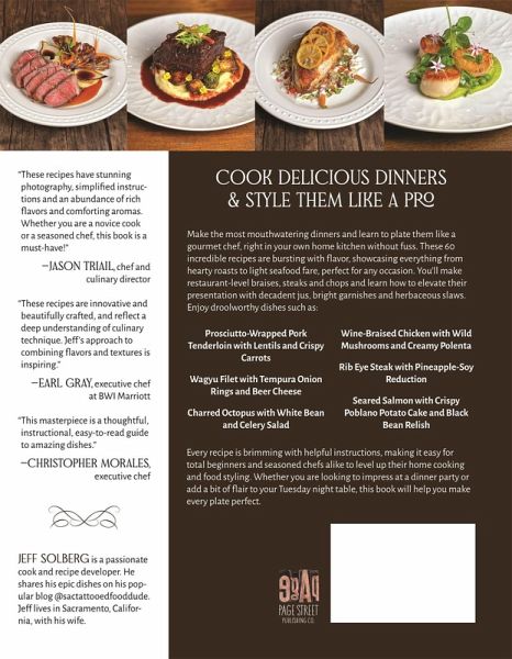 Cook Delicious Dinners & Style Them Like a Pro Make the most mouthwatering dinners and learn to plate them like a gourmet chef, right in your own home kitchen without fuss. These 60 incredible recipes are bursting with flavor, showcasing everything from hearty roasts to light seafood fare, perfect for any occasion. You'll make restaurant-level braises, steaks and chops and learn how to elevate their presentation with decadent jus, bright garnishes and herbaceous slaws. Enjoy droolworthy dishes such as: Prosciutto-Wrapped Pork Tenderloin with Lentils and Crispy Carrots Wagyu Filet with Tempura Onion Rings and Beer Cheese Charred Octopus with White Bean and Celery Salad Wine-Braised Chicken with Wild Mushrooms and Creamy Polenta Rib-Eye Steak with Pineapple-Soy Reduction Seared Salmon with Crispy Poblano Potato Cake and Black Bean Relish Every recipe is brimming with helpful instructions, making it easy for total beginners and seasoned chefs alike to level up their home cooking and food styling. Whether you are looking to impress at a dinner party or add a bit of flair to your Tuesday night table, this book will help you make every plate perfect.