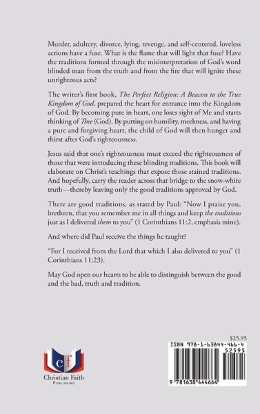 Murder, adultery, divorce, lying, revenge, and self-centered, loveless actions have a fuse. What is the flame that will light that fuse? Have the traditions formed through the misinterpretation of God's word blinded man from the truth and from the fire that will ignite these unrighteous acts? The writer's first book, The Perfect Religion: A Beacon to the True Kingdom of God, prepared the heart for entrance into the Kingdom of God. By becoming pure in heart, one loses sight of Me and starts thinking of Thee (God). By putting on humility, meekness, and having a pure and forgiving heart, the child of God will then hunger and thirst after God's righteousness. Jesus said that one's righteousness must exceed the righteousness of those that were introducing these blinding traditions. This book will elaborate on Christ's teachings that expose those stained traditions. And hopefully, carry the reader across that bridge to the snow-white truth-thereby leaving only the good traditions approved by God. There are good traditions, as stated by Paul: "Now I praise you, brethren, that you remember me in all things and keep the traditions just as I delivered them to you" (1 Corinthians 11:2, emphasis mine). And where did Paul receive the things he taught? "For I received from the Lord that which I also delivered to you" (1 Corinthians 11:23). May God open our hearts to be able to distinguish between the good and the bad, truth and tradition.