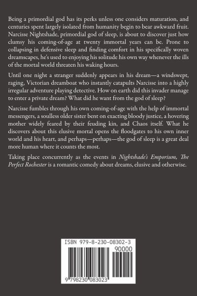 Being a primordial god has its perks unless one considers maturation, and centuries spent largely isolated from humanity begin to bear awkward fruit. Narcisse Nightshade, primordial god of sleep, is about to discover just how clumsy his coming-of-age at twenty immortal years can be. Prone to collapsing in defensive sleep and finding comfort in his specifically woven dreamscapes, he's used to enjoying his solitude his own way whenever the ills of the mortal world threaten his waking hours. Until one night a stranger suddenly appears in his dream-a windswept, raging, Victorian dreamboat who instantly catapults Narcisse into a highly irregular adventure playing detective. How on earth did this invader manage to enter a private dream? What did he want from the god of sleep? Narcisse fumbles through his own coming-of-age with the help of immortal messengers, a soulless older sister bent on exacting bloody justice, a hovering mother widely feared by their feuding kin, and Chaos itself. What he discovers about this elusive mortal opens the floodgates to his own inner world and his heart, and perhaps-perhaps-the god of sleep is a great deal more human where it counts the most. Taking place concurrently as the events in Nightshade's Emporium, The Perfect Rochester is a romantic comedy about dreams, elusive and otherwise.