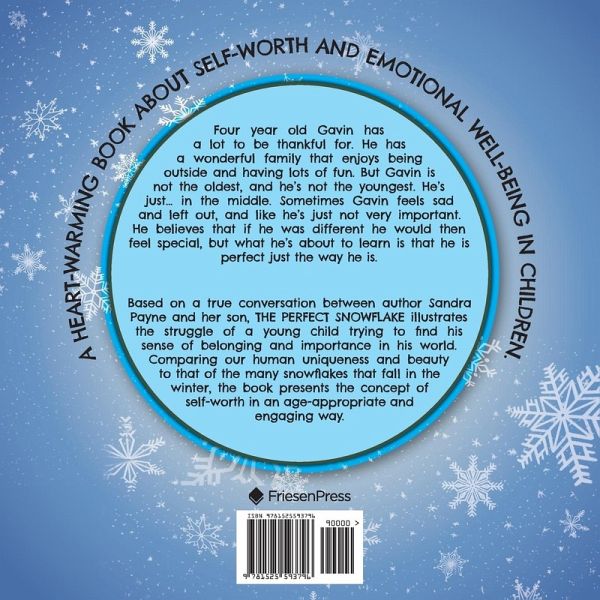 Four year old Gavin has a lot to be thankful for. He has a wonderful family that enjoys being outside and having lots of fun. But Gavin is not the oldest, and he's not the youngest. He's just... in the middle. Sometimes Gavin feels sad and left out, and like he's just not very important. He believes that if he was different he would then feel special, but what he's about to learn is that he is perfect just the way he is. Based on a true conversation between author Sandra Payne and her son, THE PERFECT SNOWFLAKE illustrates the struggle of a young child trying to find his sense of belonging and importance in his world. Comparing our human uniqueness and beauty to that of the many snowflakes that fall in the winter, the book presents the concept of self-worth in an age-appropriate and engaging way.