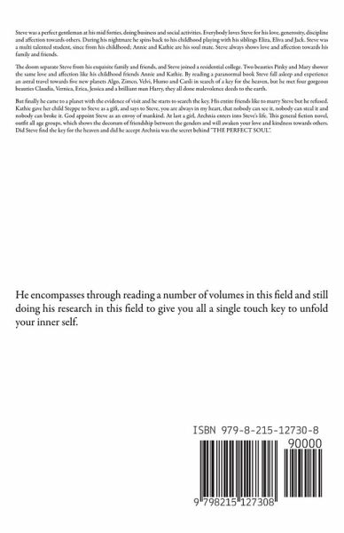 Steve was a perfect gentleman at his mid forties, doing business and social activities. Everybody loves Steve for his love, generosity, discipline and affection towards others. During his nightmare he spins back to his childhood playing with his siblings Eliza, Eliva and Jack. Steve was a multi talented student, since from his childhood; Annie and Kathie are his soul mate. Steve always shows love and affection towards his family and friends. The doom separate Steve from his exquisite family and friends, and Steve joined a residential college. Two beauties Pinky and Mary shower the same love and affection like his childhood friends Annie and Kathie. By reading a paranormal book Steve fall asleep and experience an astral travel towards five new planets Algo, Zimco, Velvi, Humo and Canli in search of a key for the heaven, but he met four gorgeous beauties Claudia, Vernica, Erica, Jessica and a brilliant man Harry, they all done malevolence deeds to the earth. But finally he came to a planet with the evidence of visit and he starts to search the key. His entire friends like to marry Steve but he refused. Kathie gave her child Steppe to Steve as a gift, and says to Steve, you are always in my heart, that nobody can see it, nobody can steal it and nobody can broke it. God appoint Steve as an envoy of mankind. At last a girl, Archnia enters into Steve's life. This general fiction novel, outfit all age groups, which shows the decorum of friendship between the genders and will awaken your love and kindness towards others. Did Steve find the key for the heaven and did he accept Archnia was the secret behind "THE PERFECT SOUL".