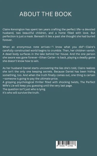 A Wife. A Mother. A Liar.Claire Kensington has the perfect life-until a single note shatters everything. "I know what you did."For ten years, Claire has buried a deadly secret. But when her children disappear, a body is found in the lake, and a ghost from her past resurfaces, she realizes the past never stays buried.As her husband, Daniel, starts uncovering the cracks in her carefully constructed world, Claire is forced into a dangerous game of deception and survival. Someone is watching. Someone knows the truth. And they won't stop until Claire loses everything.But Daniel has secrets of his own.And when the final lie is exposed, one thing is certain-not everyone will make it out alive.A gripping psychological thriller packed with shocking twists, dark secrets, and an ending you won't see coming, The Perfect Wife's Lie will leave you breathless until the very last page.Can you trust the ones you love? Or are they the ones who will destroy you?