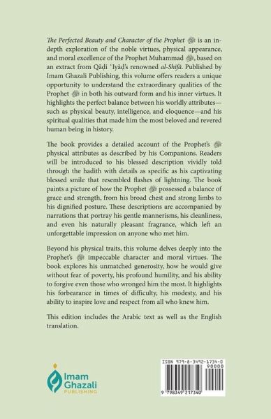 The Perfected Beauty and Character of the Prophet ¿ is an in-depth exploration of the noble virtues, physical appearance, and moral excellence of the Prophet Muhammad ¿, based on an extract from Qadi 'lyad's renowned al-Shifa. Published by Imam Ghazali Publishing, this volume offers readers a unique opportunity to understand the extraordinary qualities of the Prophet ¿ in both his outward form and his inner virtues. It highlights the perfect balance between his worldly attributes-such as physical beauty, intelligence, and eloquence-and his spiritual qualities that made him the most beloved and revered human being in history. The book provides a detailed account of the Prophet's ¿ physical attributes as described by his Companions. Readers will be introduced to his blessed description vividly told through the hadith with details as specific as his captivating blessed smile that resembled flashes of lightning. The book paints a picture of how the Prophet ¿ possessed a balance of grace and strength, from his broad chest and strong limbs to his dignified posture. These descriptions are accompanied by narrations that portray his gentle mannerisms, his cleanliness, and even his naturally pleasant fragrance, which left an unforgettable impression on anyone who met him. Beyond his physical traits, this volume delves deeply into the Prophet's ¿ impeccable character and moral virtues. The book explores his unmatched generosity, how he would give without fear of poverty, his profound humility, and his ability to forgive even those who wronged him the most. It highlights his forbearance in times of difficulty, his modesty, and his ability to inspire love and respect from all who knew him. This edition includes the Arabic text as well as the English translation. Author: Qadi 'Iyad bin Musa al-Yahsubi Languages: Arabic & English (bilingual) Binding: Paperback Colour: Black & white Publisher: Imam Ghazali Publishing