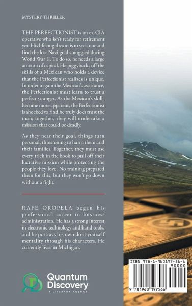 THE PERFECTIONIST is an ex-CIA operative who isn't ready for retirement yet. His lifelong dream is to seek out and find the lost Nazi gold smuggled during World War II. To do so, he needs a large amount of capital. He piggybacks off the skills of a Mexican who holds a device that the Perfectionist realizes is unique. In order to gain the Mexican's assistance, the Perfectionist must learn to trust a perfect stranger. As the Mexican's skills become more apparent, the Perfectionist is shocked to find he truly does trust the man; together, they will undertake a mission that could be deadly. As they near their goal, things turn personal, threatening to harm them and their families. Together, they must use every trick in the book to pull off their lucrative mission while protecting the people they love. No training prepared them for this, but they won't go down without a fight. RAFE OROPELA began his professional career in business administration. He has a strong interest in electronic technology and hand tools, and he portrays his own do-it-yourself mentality through his characters. He currently lives in Michigan.