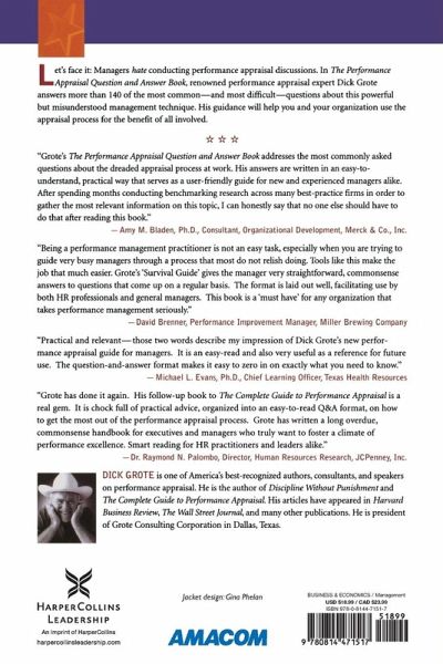 Most managers hate conducting performance appraisal discussions. What's worse, few feel confident in their ability to accurately assess the performance of a subordinate. In The Performance Appraisal Question and Answer Book, expert Dick Grote answers over 100 of the most common -- and most difficult -- questions about this vitally important but often misunderstood and misused tool.