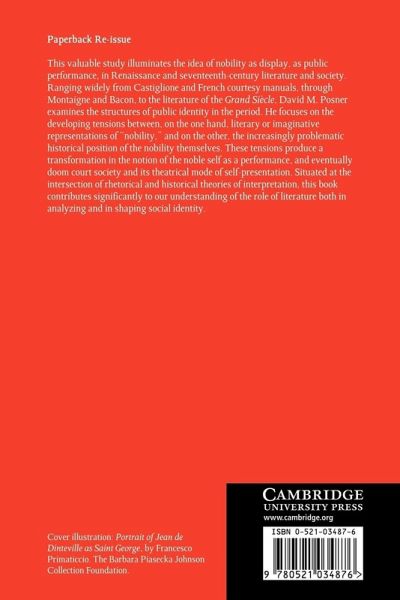 This valuable study illuminates the idea of nobility as display, as public performance, in Renaissance and seventeenth-century literature and society. Ranging widely from Castiglione and French courtesy manuals, through Montaigne and Bacon, to the literature of the Grand Siècle, David Posner examines the structures of public identity in the period. He focuses on the developing tensions between, on the one hand, literary or imaginative representations of 'nobility' and, on the other, the increasingly problematic historical position of the nobility themselves. These tensions produce a transformation in the notion of the noble self as a performance, and eventually doom court society and its theatrical mode of self-presentation. Situated at the intersection of rhetorical and historical theories of interpretation, this book contributes significantly to our understanding of the role of literature both in analysing and in shaping social identity.