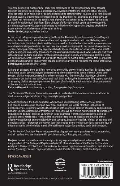 Accessibly written, the book considers whether our understanding of the sense of smell and odours in culture has changed over time, and where we locate olfaction in theories of psychoanalysis. Beginning with the theorisation of the sense of smell in philosophy and medicine, Berjanet Jazani explores what treatment of this sense we can find in historical and contemporary linguistic and cultural context. Jazani then takes examples from the psychoanalytic clinic as well as cultural references, from cinema to ancient literature, to elaborate the marks of the olfactory experiences on our subjectivity and sexuality. Lacanian theories, clinical anecdotes and autobiographical references are woven together to raise some critical questions about the law of odours as well as the invisible marks of breathing on subjective position, body, and symptom.