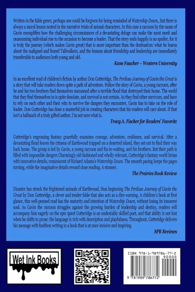 A middle-grade novel, a fable about a raccoon who tries to guide his animal brethren home after disaster strikes. When Gavin awakens on a fallen tree trunk, the raccoon is certain the catastrophic flood that hit Earthwood was only a nightmare. But it really happened, and that trunk has likely been floating aimlessly for some time. Luckily, he soon finds his brothers, Trisbert and Cuyler, as well as other "woods-creatures," including rabbits, mice, and a snake. When they finally get an inkling as to where they are, they realize getting back to Earthwood will be an arduous trek-through the predator-filled Forest of Everdark. Gavin, the oldest grandson of Earthwood's "clan coon" head, becomes the flood survivors' leader. They're in danger of terrifying foes, from wolves and coyotes to "universally evil" Tallwalkers who wield lethal "firesticks." Courage is a must, but they'll need brains as well to safely cross bodies of water and outwit predators that would otherwise devour them. All the while, they can only hope their missing friends and families are waiting for them. Gutteridge's gripping novel is often dark; threats against the woods-creatures are constant, and not everyone makes it to the end. It's nevertheless exciting as Gavin and the rest overcome obstacles in their path and enemies (like a fox) form alliances. What little humor there is comes courtesy of the woods-creatures' interpretations of humans, who speak "Gibberlish" and drive "doomsmobiles." These animals constitute a huge, appealing cast, including Gavin, a great commander in the making, and the porcupine Quiver, who either uses words incorrectly (a noble sediment) or simply makes them up (temcrestuous). Along with charming nods to Scripture and literature, from the biblical story of Noah and the flood to the Knights of the Round Table, this journey delivers a handful of surprises, particularly an effective final-act twist. A riveting morality tale with a marvelous forest-dwelling cast in line with Watership Down.