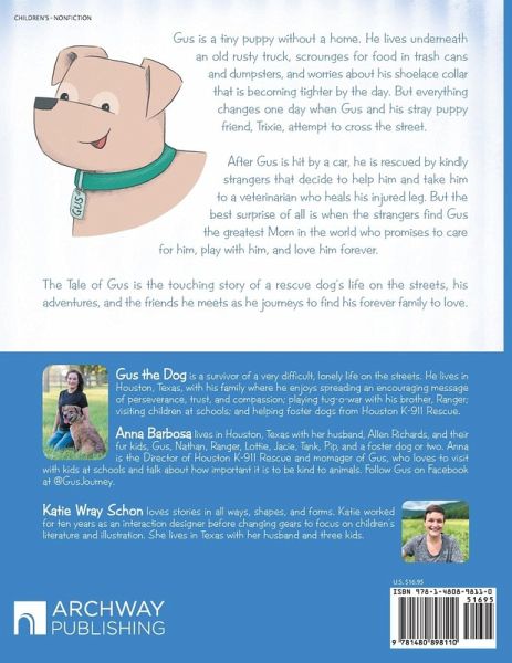 Gus is a tiny puppy without a home. He lives underneath an old rusty truck, scrounges for food in trash cans and dumpsters, and worries about his shoelace collar that is becoming tighter by the day. But everything changes one day when Gus and his stray puppy friend, Trixie, attempt to cross the street. After Gus is hit by a car, he is rescued by kindly strangers that decide to help him and take him to a veterinarian who heals his injured leg. But the best surprise of all is when the strangers find Gus the greatest Mom in the world who promises to care for him, play with him, and love him forever. The Tale of Gus is the touching story of a rescue dog's life on the streets, his adventures, and the friends he meets as he journeys to find his forever family to love.