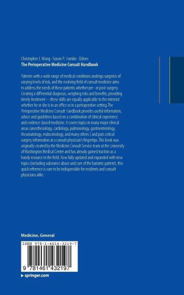 Patients with a wide range of medical conditions undergo surgeries of varying levels of risk, and the evolving field of consult medicine aims to address the needs of these patients whether pre- or post-surgery. Creating a differential diagnosis, weighing risks and benefits, providing timely treatment--these skills are equally applicable to the internist whether he or she is in an office or in a perioperative setting. The Perioperative Medicine Consult Handbook provides useful information, advice and guidelines based on a combination of clinical experience and evidence-based medicine. It covers topics in many major clinical areas (anesthesiology, cardiology, pulmonology, gastroenterology, rheumatology, endocrinology, and many others ) and puts critical surgery information at a consult physician's fingertips. This book was originally created by the Medicine Consult Service team at the University of Washington Medical Center and has already gained traction as a handy resource in the field. Now fully updated and expanded with new topics (including substance abuse and obesity), this quick reference is sure to be indispensible for residents and consult physicians alike.