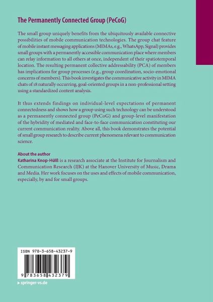 The small group uniquely benefits from the ubiquitously available connective possibilities of mobile communication technologies. The group chat feature of mobile instant messaging applications (MIMAs, e.g., WhatsApp, Signal) provides small groups with a permanently accessible communication place where members can relay information to all others at once, independent of their spatiotemporal location. The resulting permanent collective addressability (PCA) of members has implications for group processes (e.g., group coordination, socio-emotional concerns of members). This book investigates the communicative activity in MIMA chats of 18 naturally occurring, goal-oriented groups in a non-professional setting using a standardized content analysis.