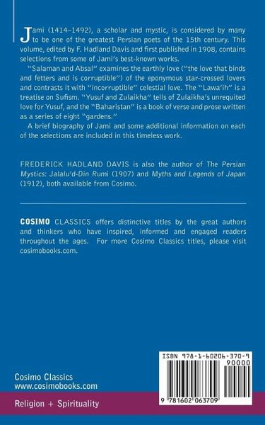 Jami (1414-1492), a scholar and mystic, is considered by many to be one of the greatest Persian poets of the 15th century. This volume, edited by F. Hadland Davis and first published in 1908, contains selections from some of Jami's best-known works. "Salaman and Absal" examines the earthly love ("the love that binds and fetters and is corruptible") of the eponymous star-crossed lovers and contrasts it with "incorruptible" celestial love. The "Lawa'ih" is a treatise on Sufism. "Yusuf and Zulaikha" tells of Zulaikha's unrequited love for Yusuf, and the "Baharistan" is a book of verse and prose written as a series of eight "gardens." A brief biography of Jami and some additional information on each of the selections are included in this timeless work. FREDERICK HADLAND DAVIS is also the author of The Persian Mystics: Jalalu'd-Din Rumi (1907) and Myths and Legends of Japan (1912), both available from Cosimo.